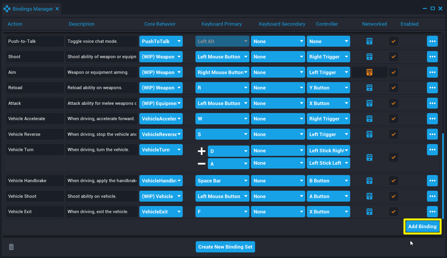 Bindings can be networked so the value and input events are replicated to the server. Replicated bindings allow creators to use specific Input functions and events in a server script using Lua. Networked bindings can be set individually or for all child bindings of a Binding Set in the Bindings Manager.