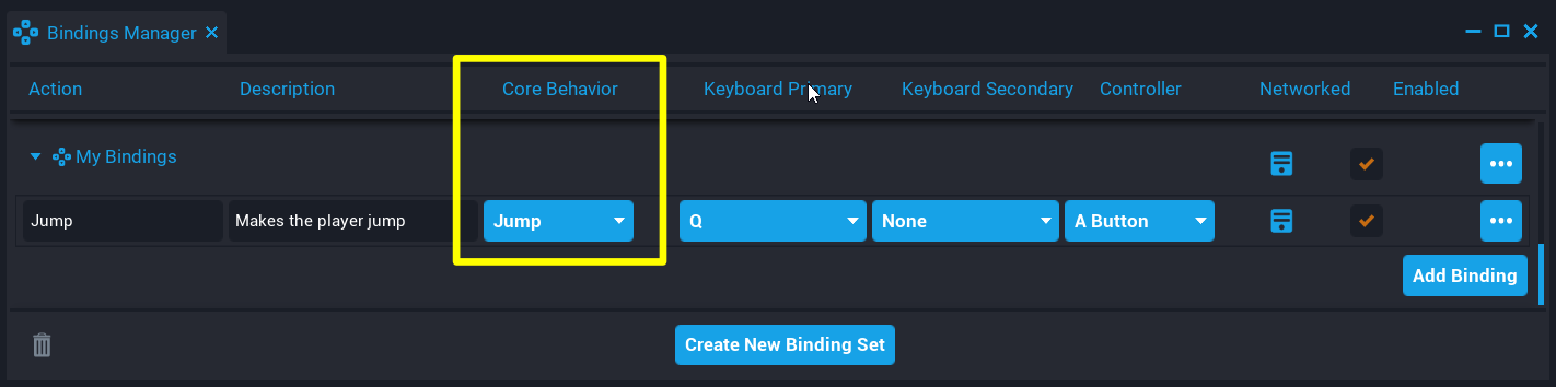 When creating a binding, a Core Behavior needs to be selected so that the Binding Set knows which action to perform when the binding is triggered. When a Core Behavior is selected, the binding will get auto-filled with the default Core values for the keyboard and controller inputs.