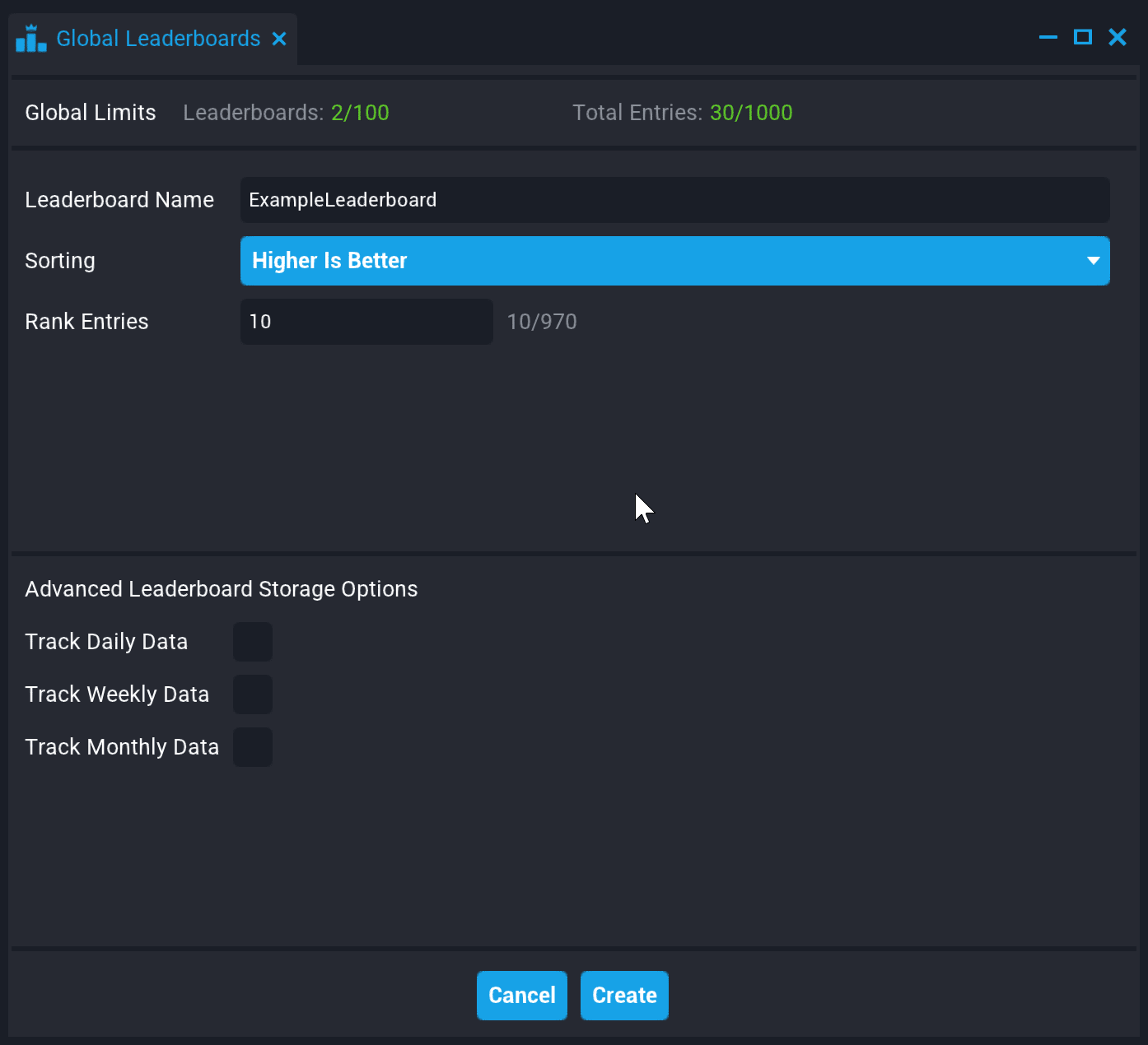 - Check the boxes by Track Daily Data, Track Weekly Data, or Track Monthly Data to create additional copies of the Leaderboard that delete entries after a certain amount of time.