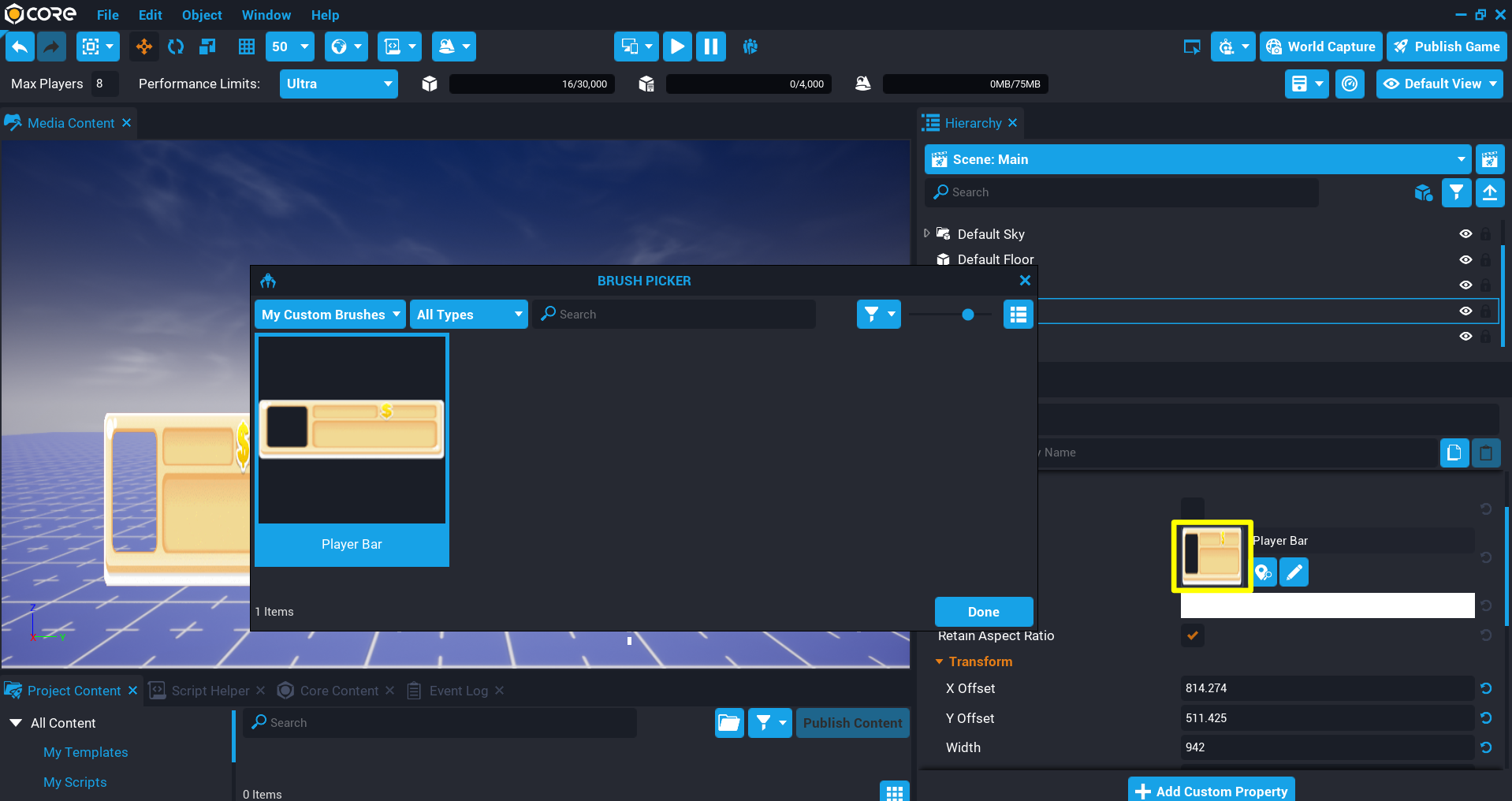 Creators may notice that brushes that get added to the Hierarchy do not maintain the original aspect ratio of the image. By enabling the option Retain Aspect Ratio in the Properties window of the UI Image, the aspect ratio will be retained regardless of its given dimensions.