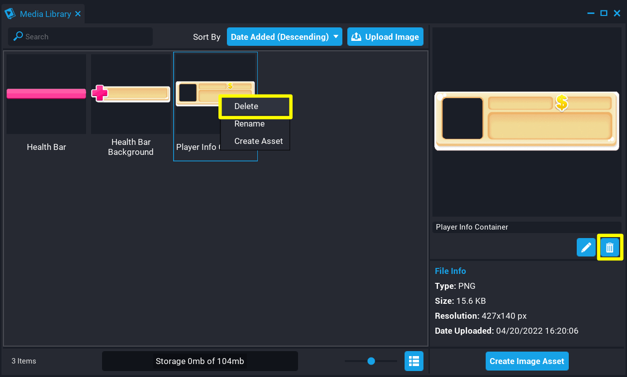 Deleting images from the Media Library can be done by right-clicking on the image and selecting Delete, or from the preview panel in the Media Library. Deleting an image will delete it from the Media Library, and brushes that have been created using that image in any of the creator's projects will show up as white in the game as the image will no longer be valid.