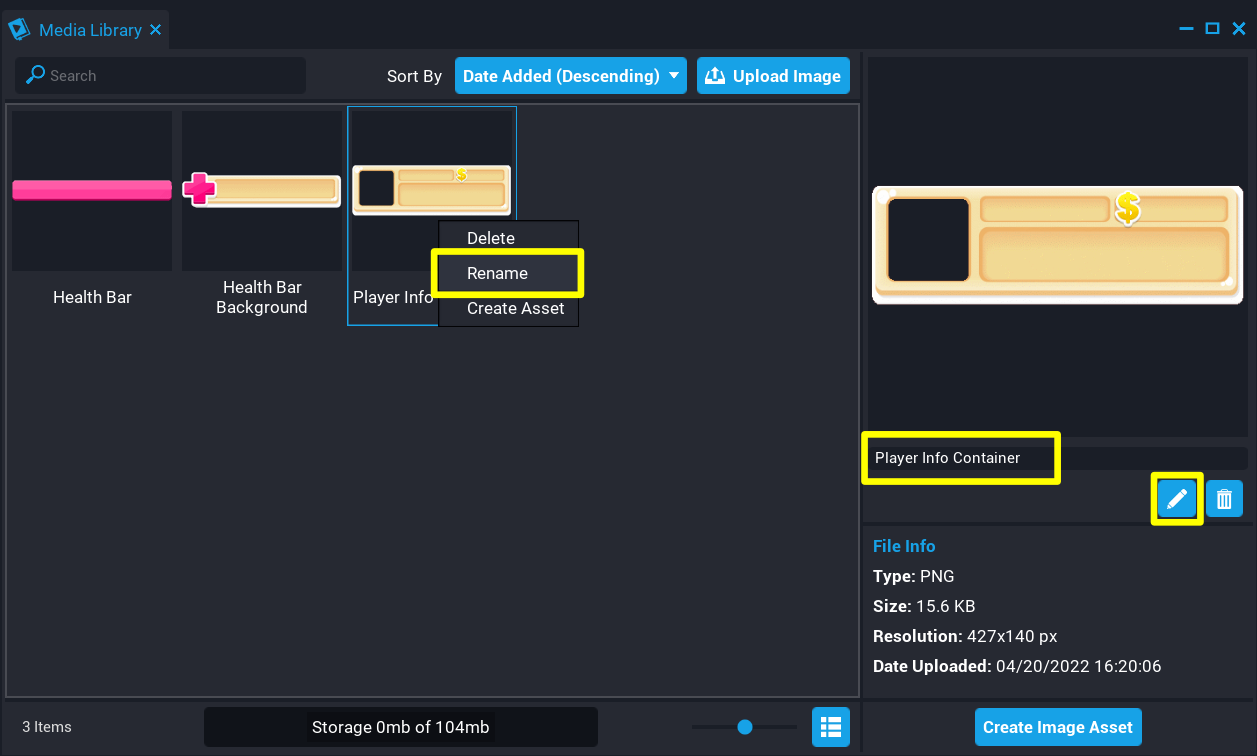 Images in the Media Library can be renamed by right-clicking on the image and selecting Rename, or from the preview panel in the Media Library. Renaming an image allows creators to keep their Media Library content organized.