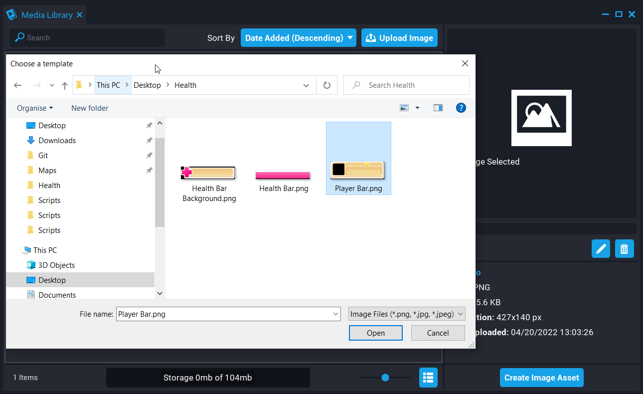 Creators can upload JPEG, JPG, and PNG files to the Media Library by clicking on the Upload Image button. When the Upload Image button is clicked on, a file dialog will appear where creators can browse for the image they want to upload to their library.