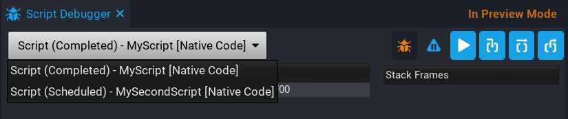 The Script Debugger will pause execution for any scripts that have breakpoints set. The Script Task dropdown lists all the scripts that are either running, scheduled, or completed. Only scripts that are running can be stepped through.
