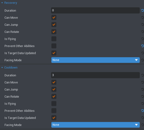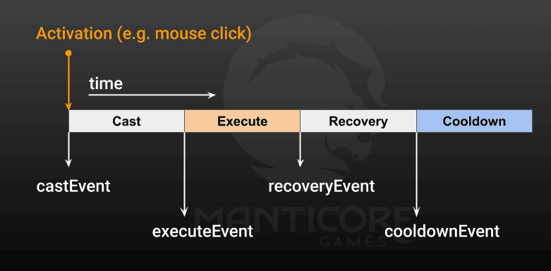 Once an ability is triggered to start, it cycles through Cast > Execute > Recovery > Cooldown. The amount of time that each phase lasts can be set in the code. These timings would be very different depending on the type of ability being created.
