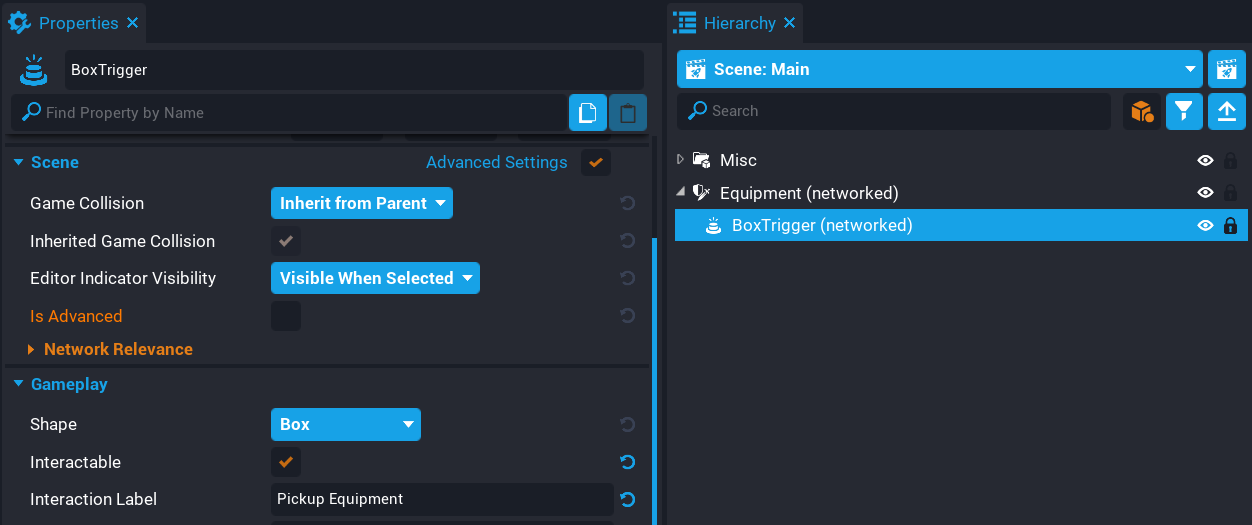 2. In the Properties window, enable Interactable, and set the Interaction Label to Pickup Equipment.
