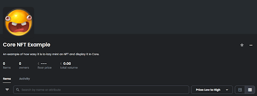 With the collection created, it is time to add a new item. On the right side of the collection page, click the options button and select Add Item. Fill out all the information that is needed for the NFT and most importantly upload the screenshot of the Core asset.