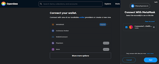 Clicking on the MetaMask option, the MetaMask extension will ask the creator if they want to connect their wallet to OpenSea. Following the MetaMask steps will then connect the wallet to OpenSea which will take them to their profile upon login.