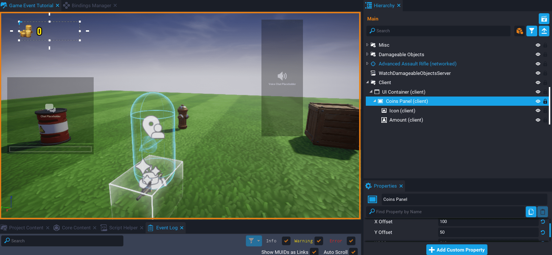 In the video below, you will see that the game event goes active. The status of the event is printed in the Event Log, notice how it changes from false to true, which means the player can earn double coins now.
