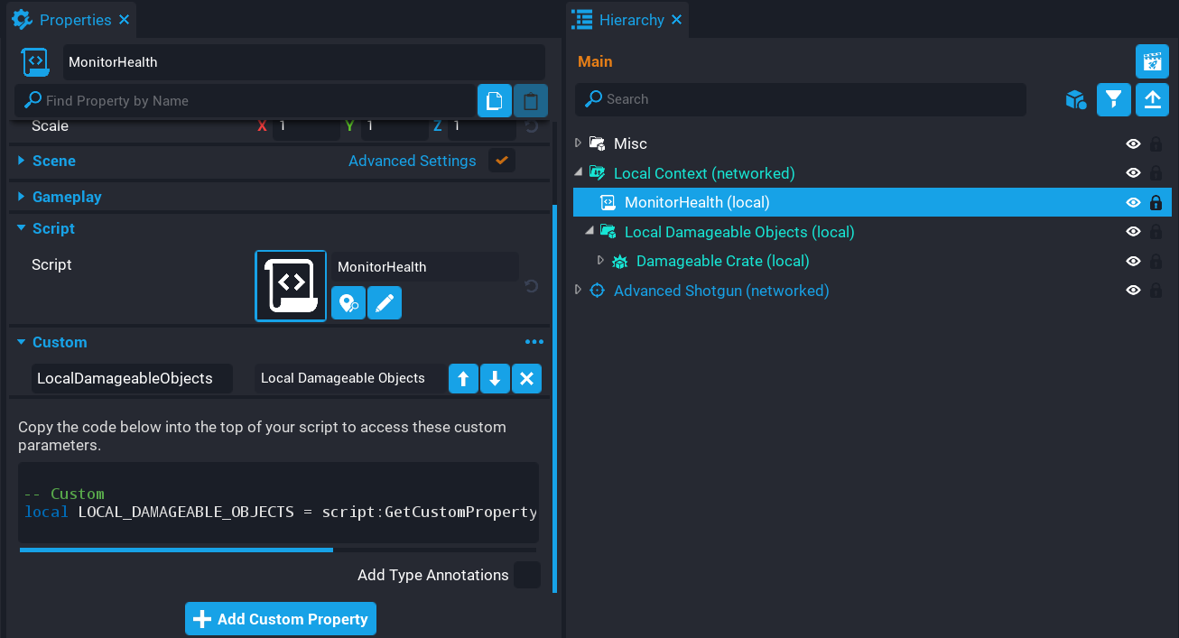 The Local Context will contain all the objects that would normally be networked. These objects (including scripts), will be spawned on the server and the client. The local context you will create will need to have networking enabled. The reason for this is that the custom networking method you will be using in this case is Dynamic Properties**. All health data for the damageable objects will be sent to the clients this way.