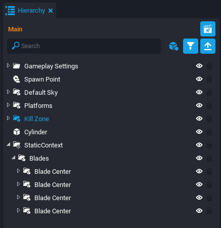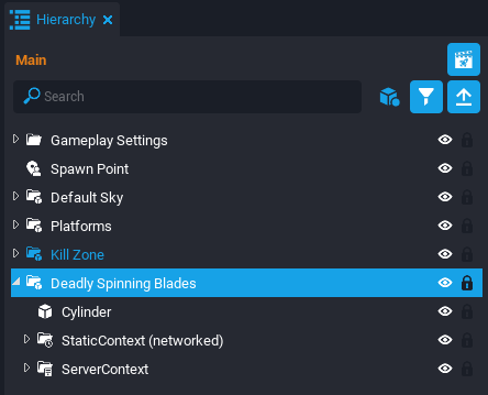 Create a new script by pressing the Script button Script above the scene. Name it MovingPlatform_Server. In the Project Content window, find the MovingPlatform_Server script in the My Scripts folder and drag it into the Hierarchy.