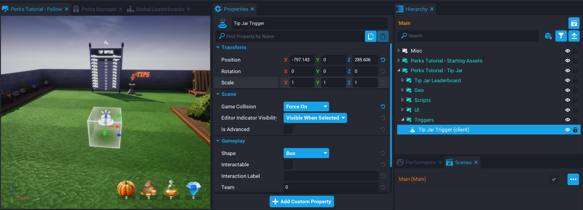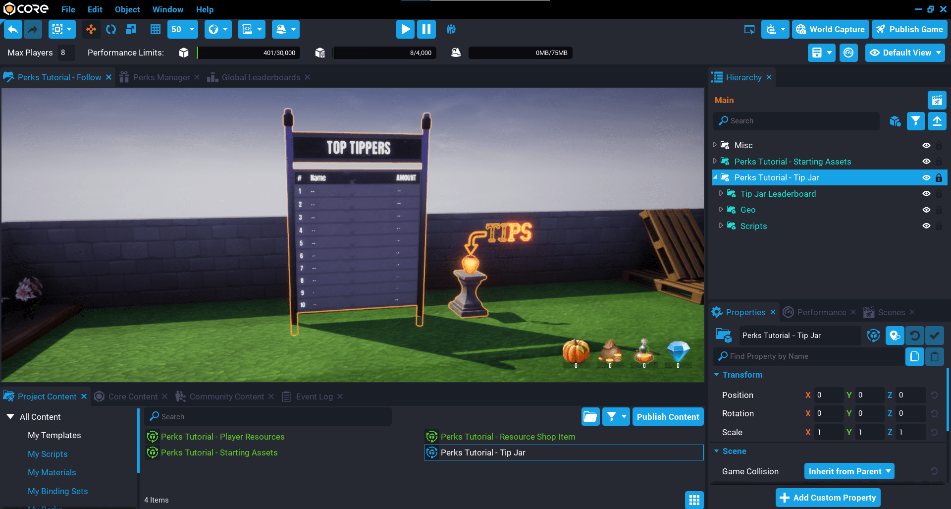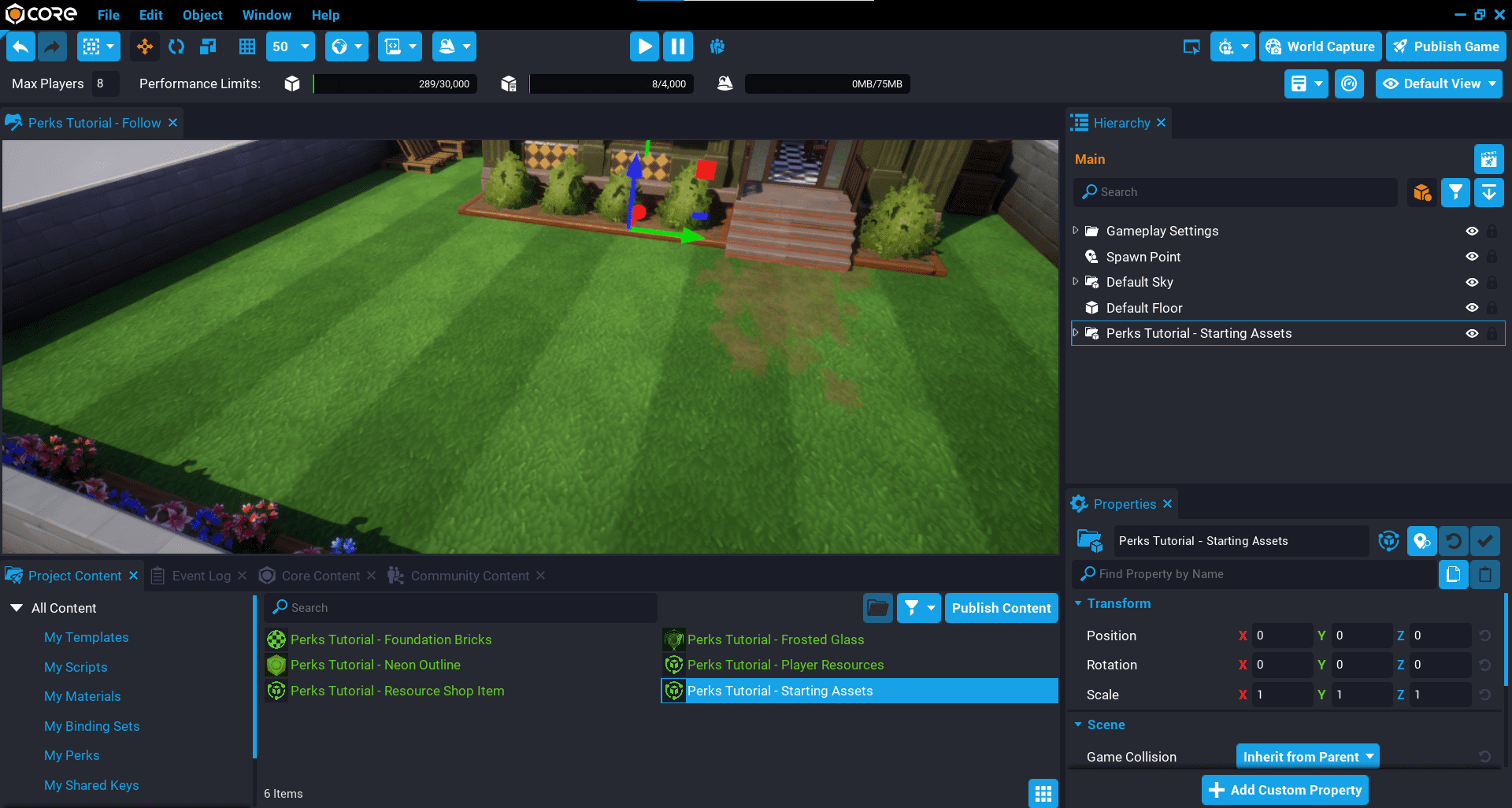 3. Add the template Perks Tutorial - Starting Assets into the Hierarchy.
