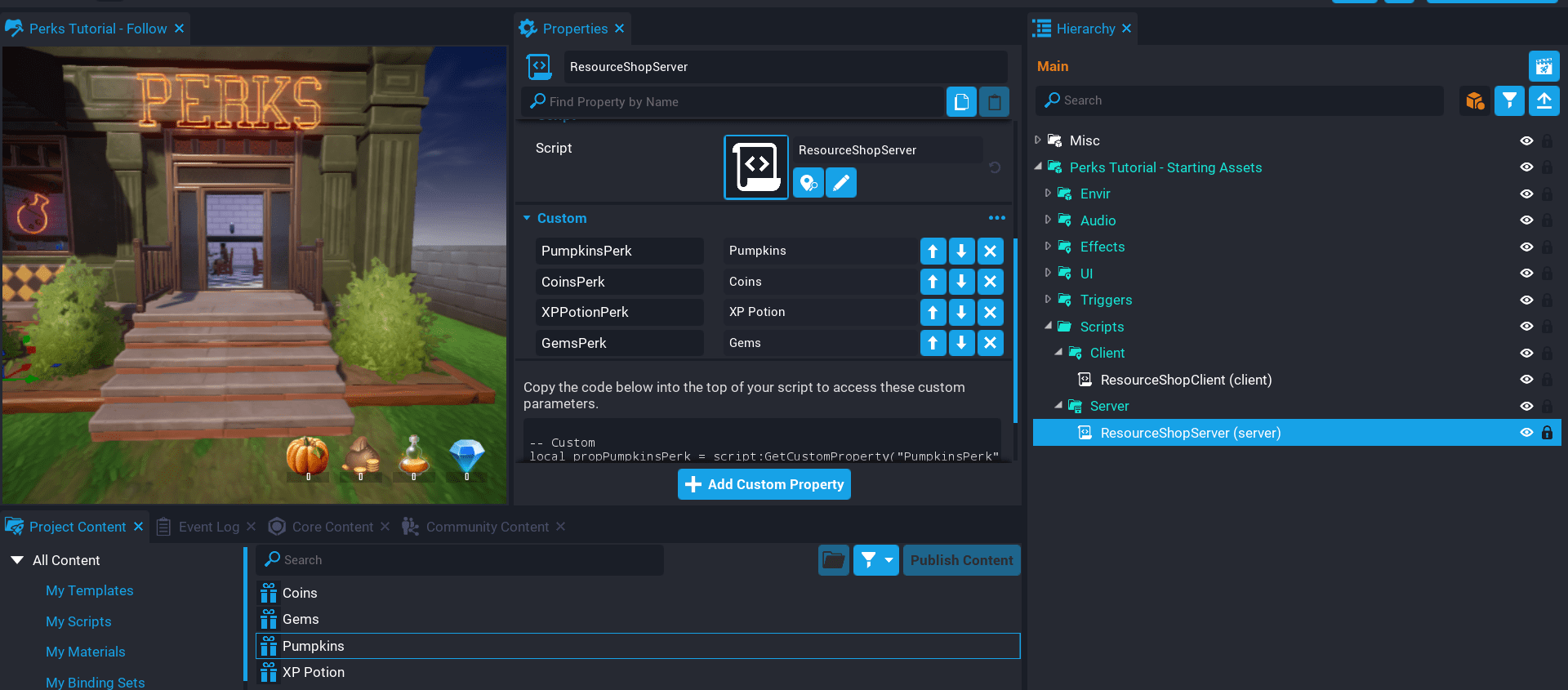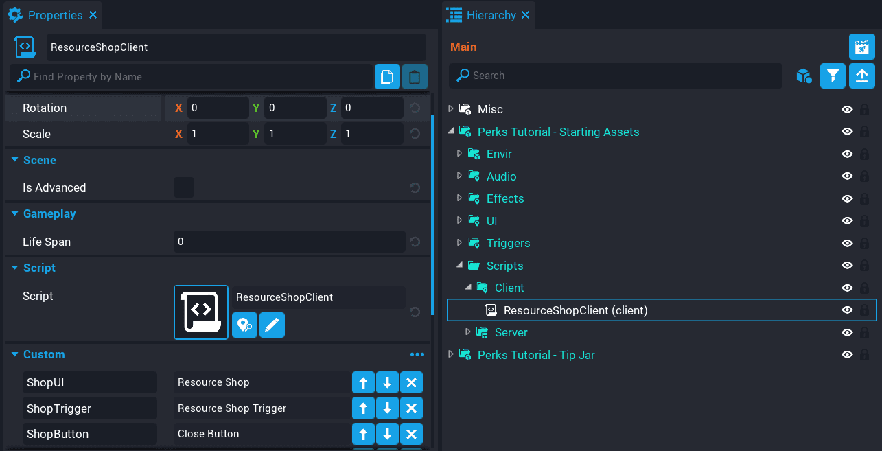 In this tutorial you will create a resource shop that sells 4 items. Below is a list of those items, and a description of what the perk could potentially be used for in a game.