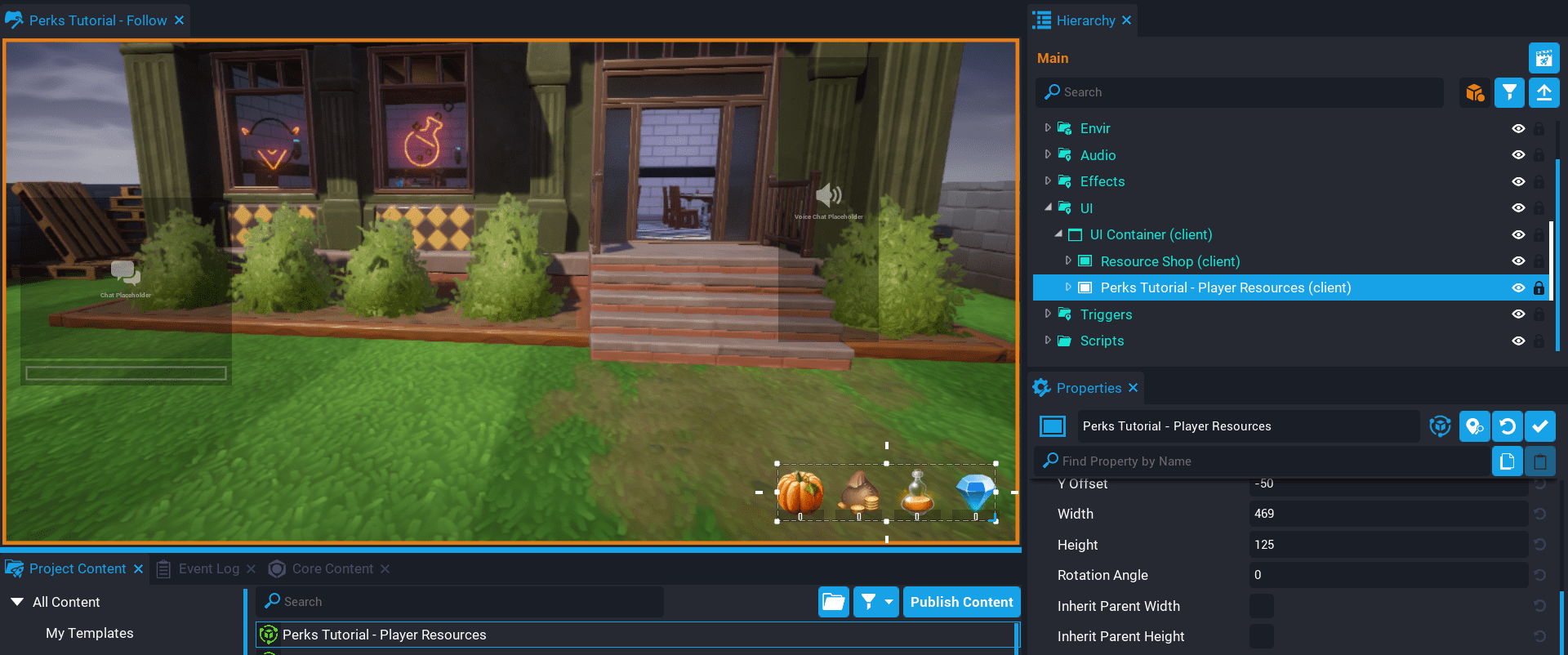 1. Drag the template Perks Tutorial - Resource Shop Item into the Items panel.