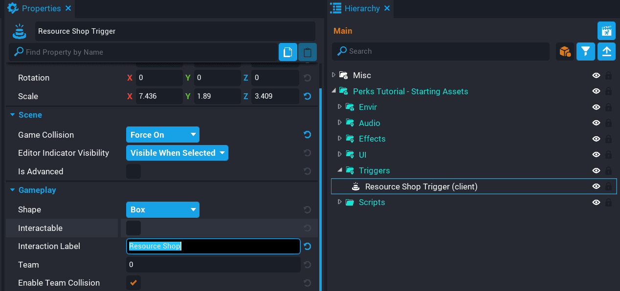 Set the Interaction Label property for the Resource Shop Trigger to Resource Shop in the Properties window.