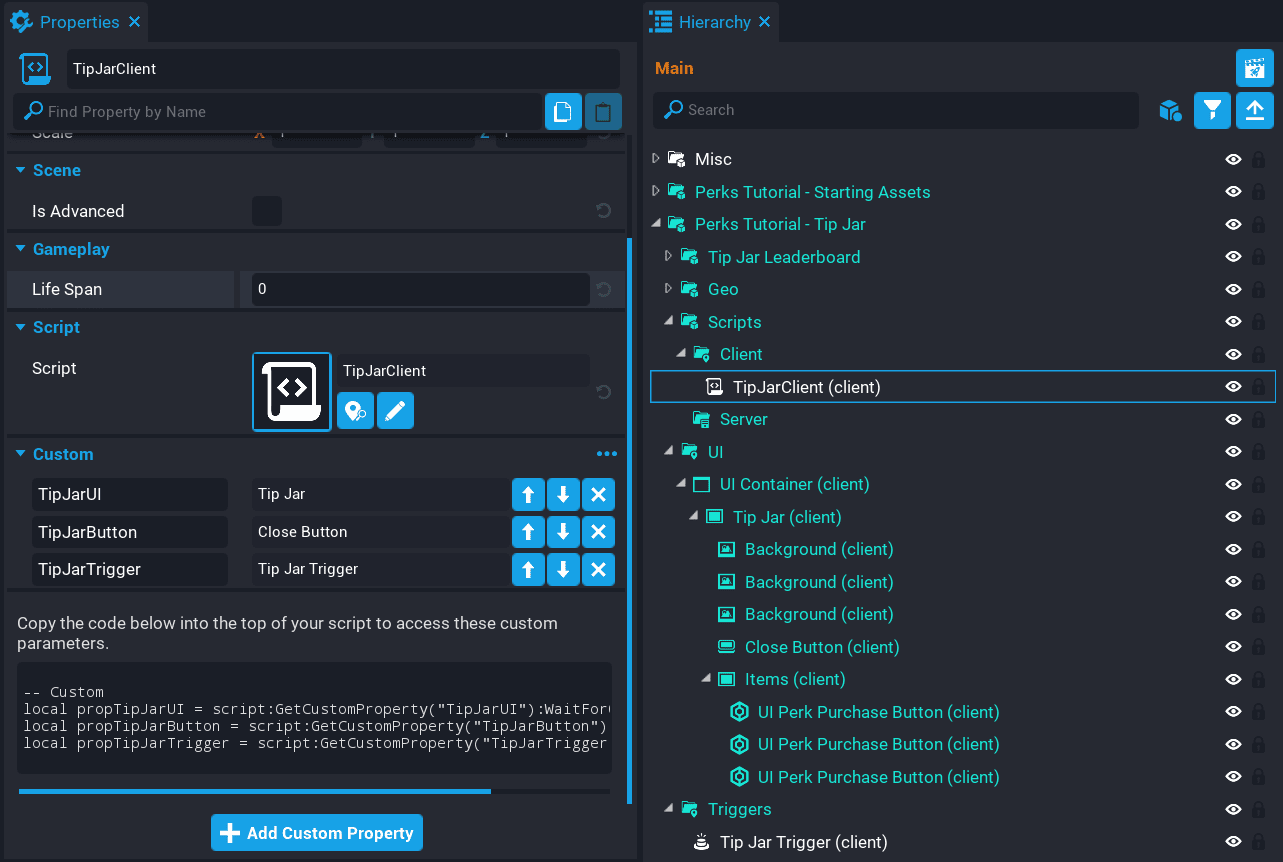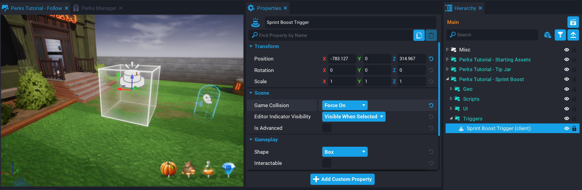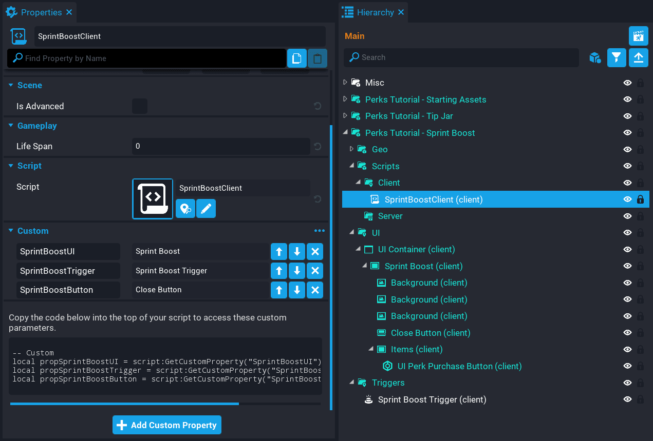 While working through the tutorial, you may have noticed how similar each system was. The way the triggers are setup, the UI, etc. This is good, because then you can take what you have learned, and apply it to another idea for selling perks to players.