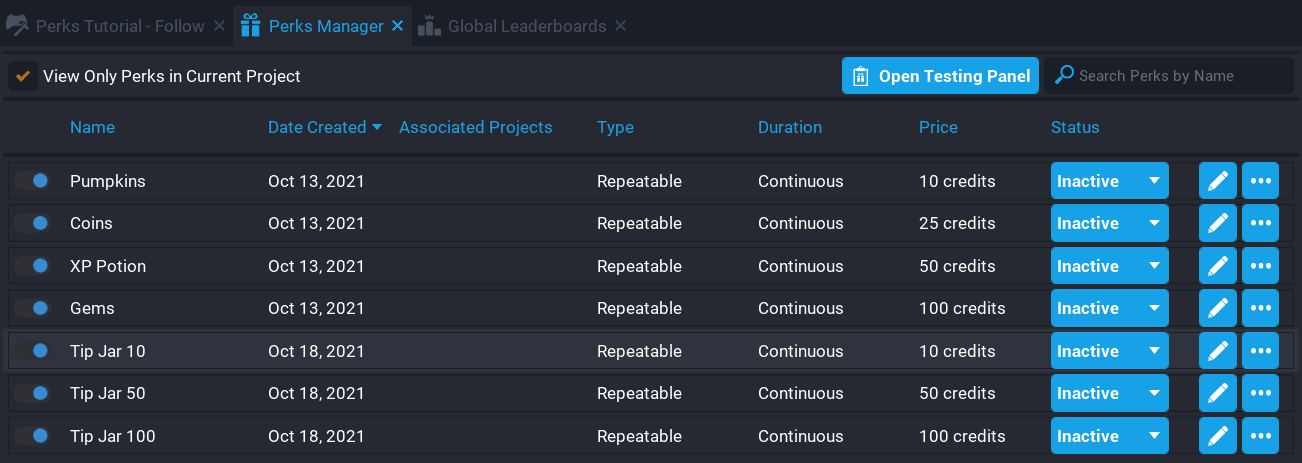 If you already have created perks for other projects, then you will see all your created perks inside the Perks Manager window. It may be useful to enable the option View Only Perks in Current Project, this will filter out all the perks that were not created in the current project.