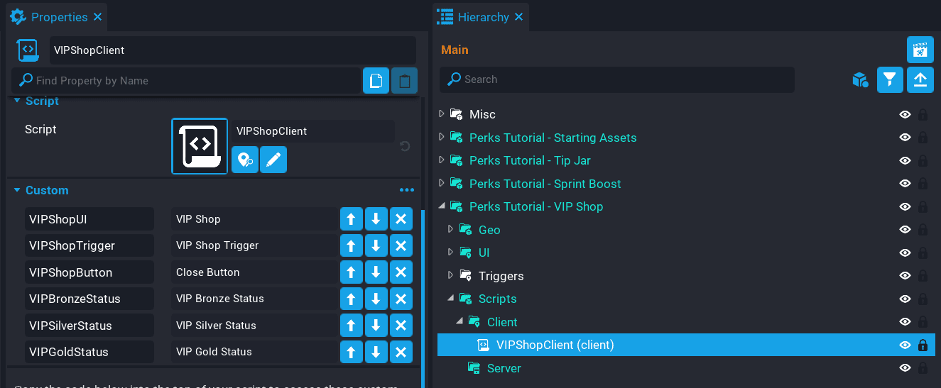 Create these variables so you have a reference to each VIP perk.