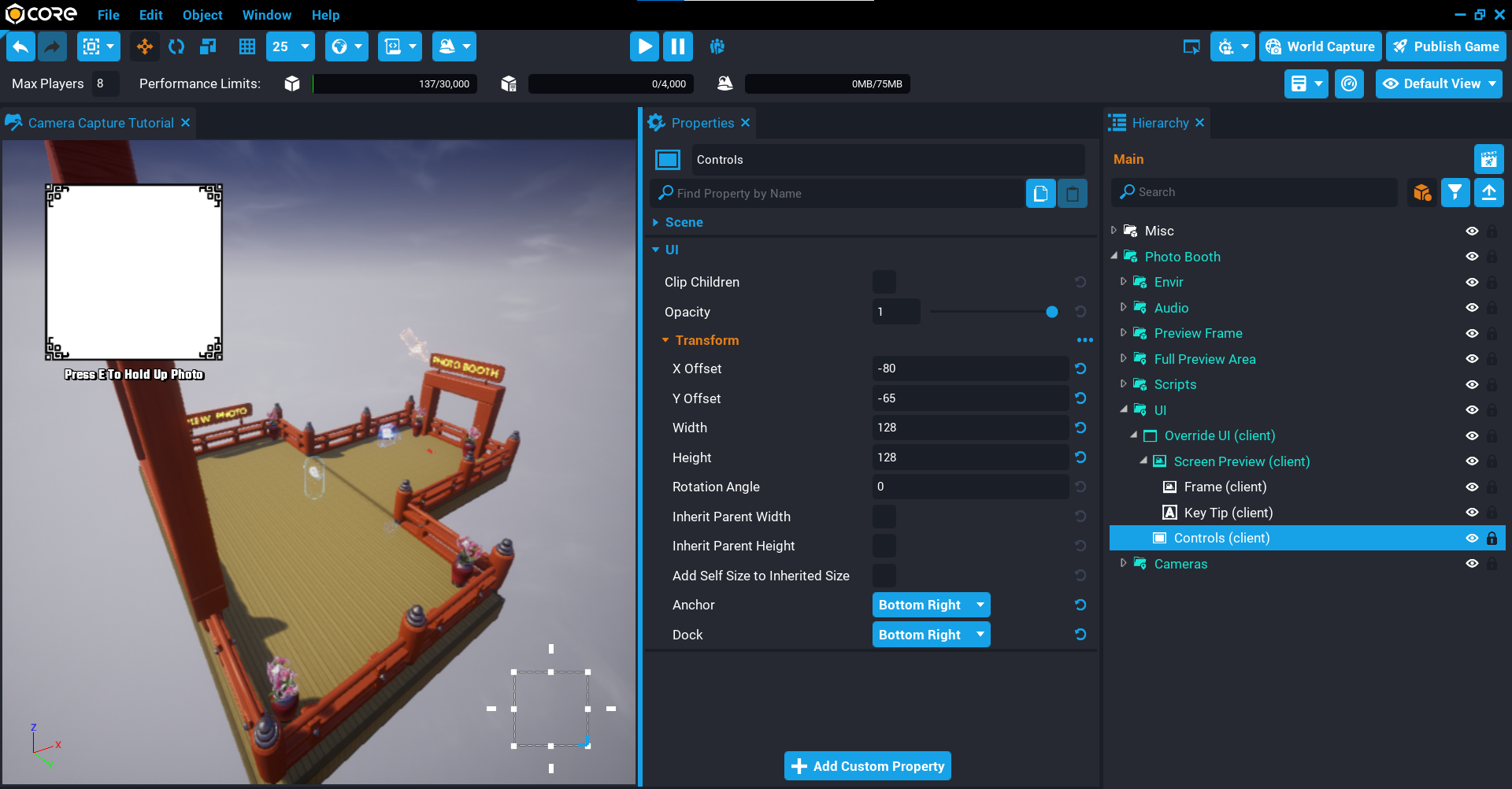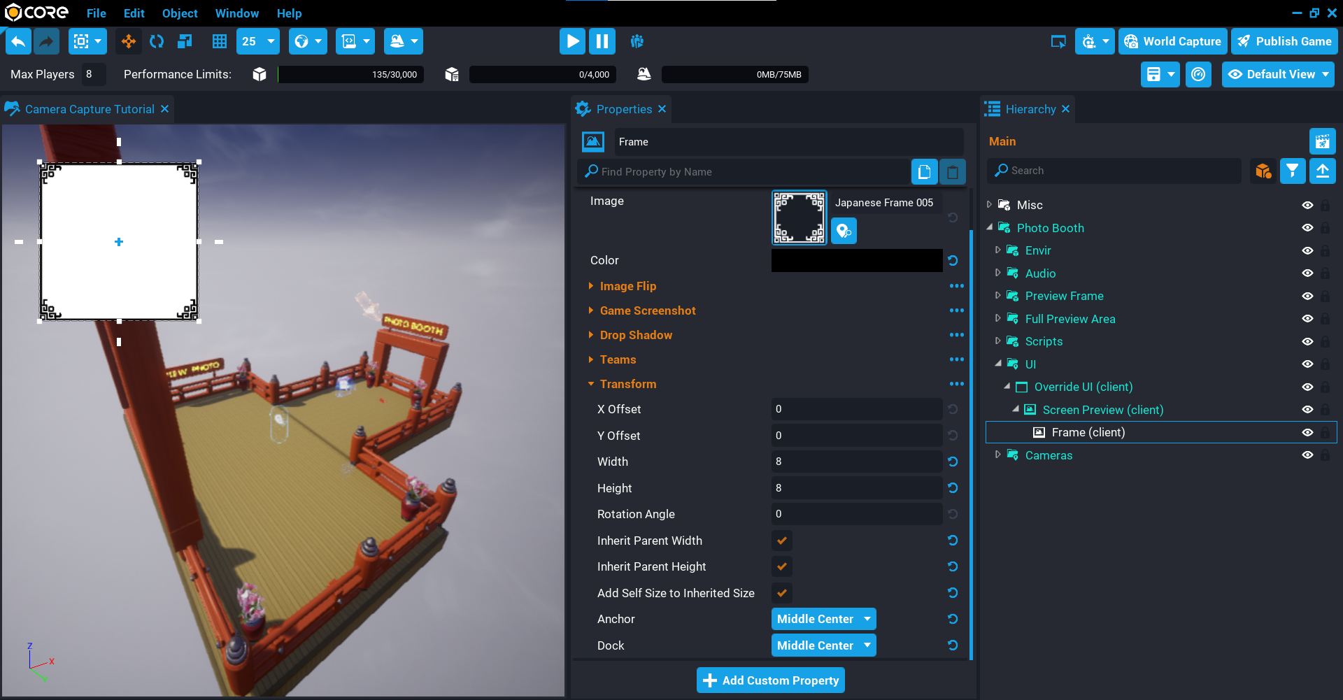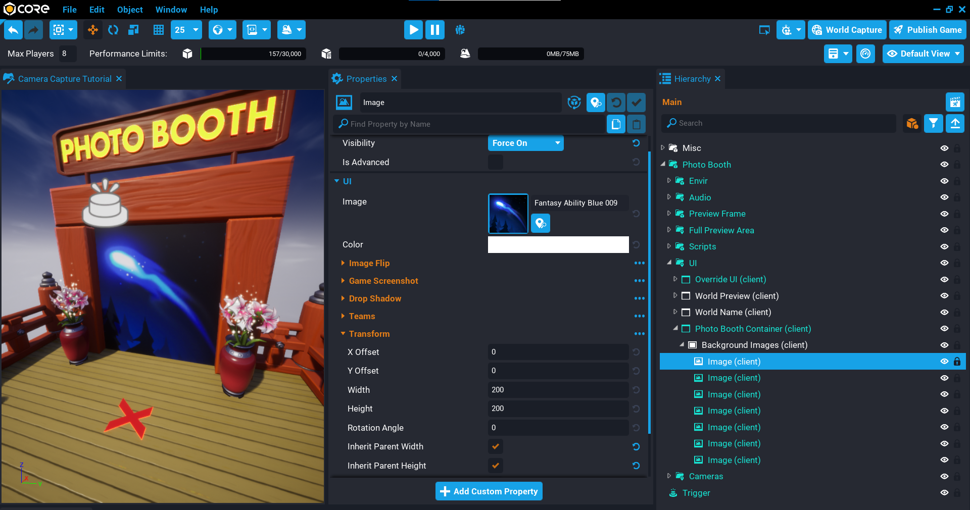 In this tutorial you will be creating a Photo Booth where players can stand in front of a Camera to take pictures of themselves and other players in the shot. These Camera Captures will be shared with the rest of the players in the game so they can see your picture. You will be using your camera capture knowledge from previous tutorials to create a multiplayer experience for your players.