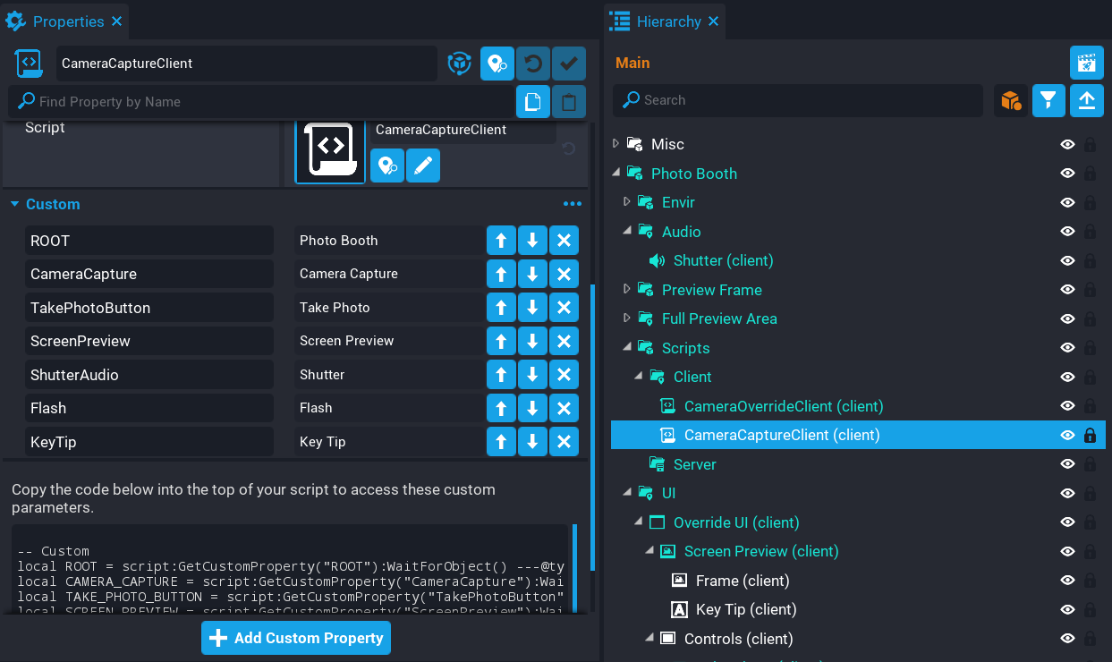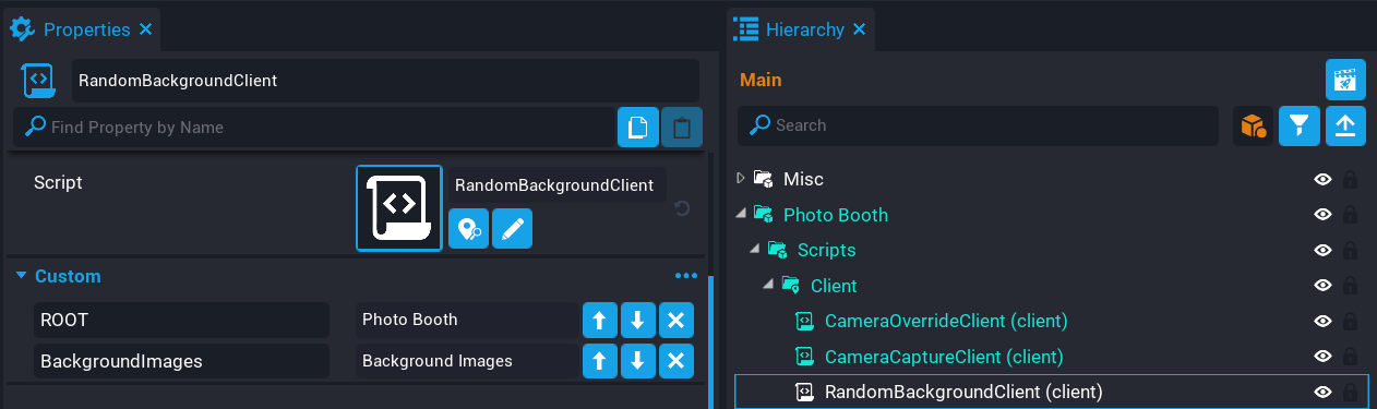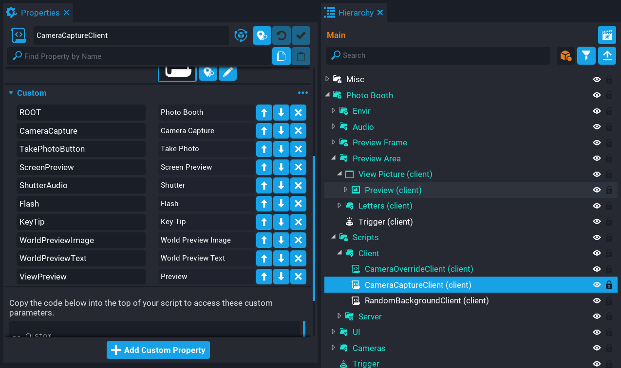 Create a script called ViewPictureClient and place it into the Client folder in the Hierarchy. This script will be responsible for showing the UI to the player when they interact with the trigger to view their picture.
