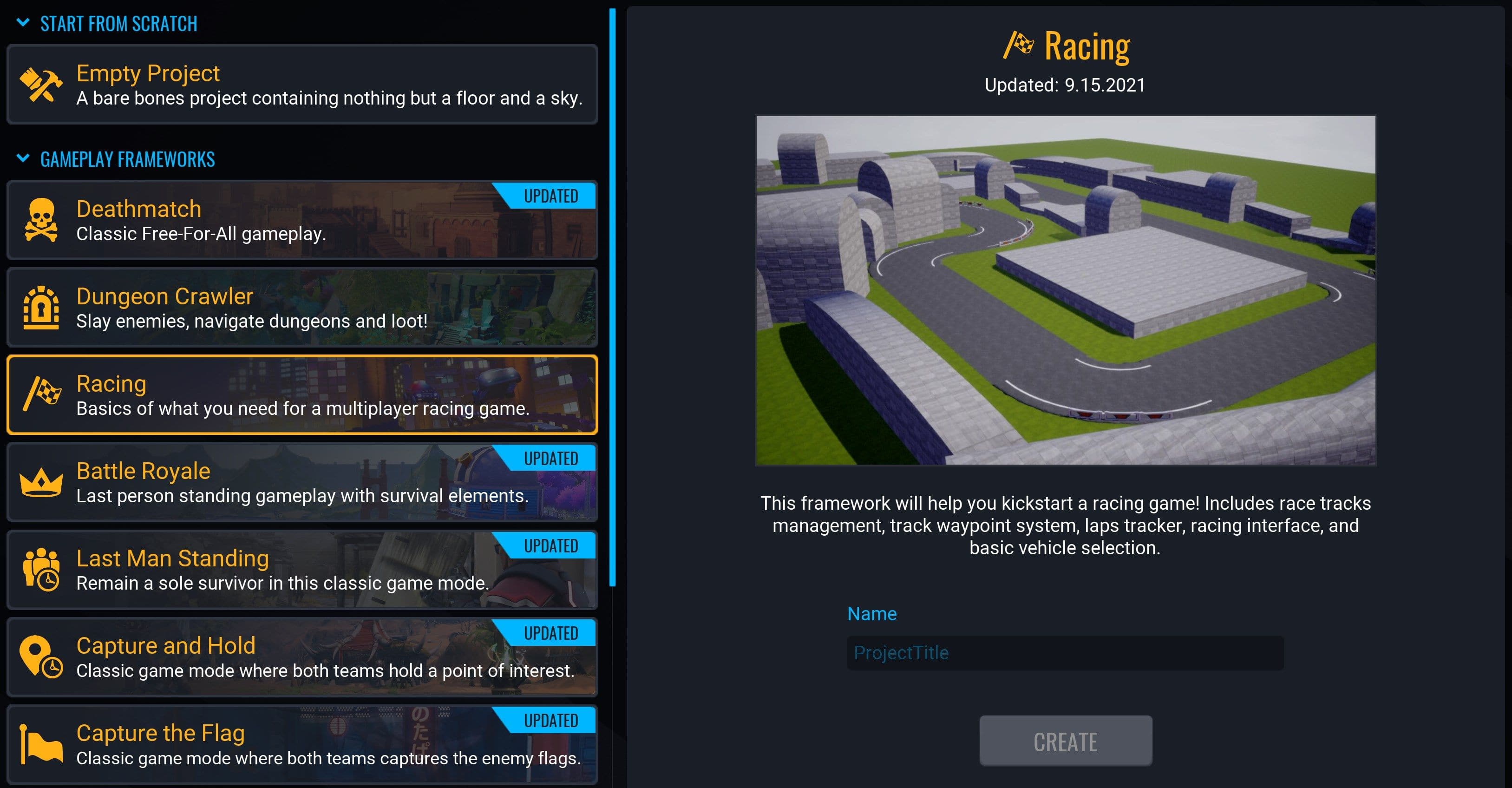1. In the GAMEPLAY FRAMEWORKS section, select Racing.