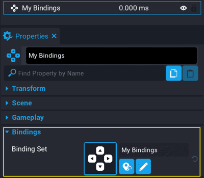Binding Sets created this way will have the property Binding Sets under Bindings already set up with the asset reference when placed into the Hierarchy.