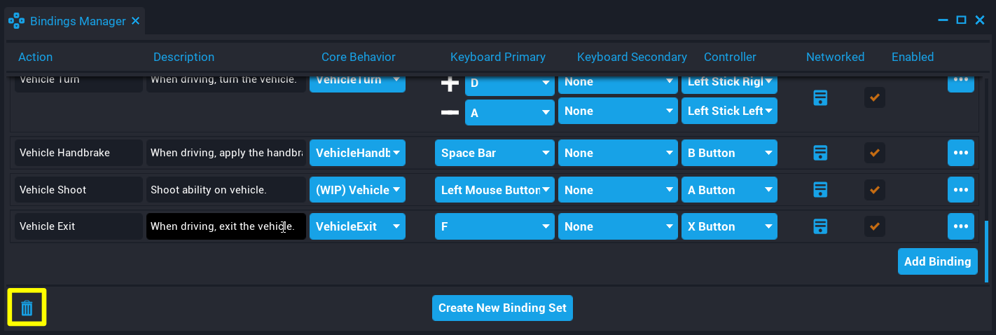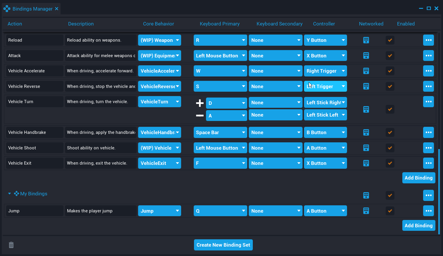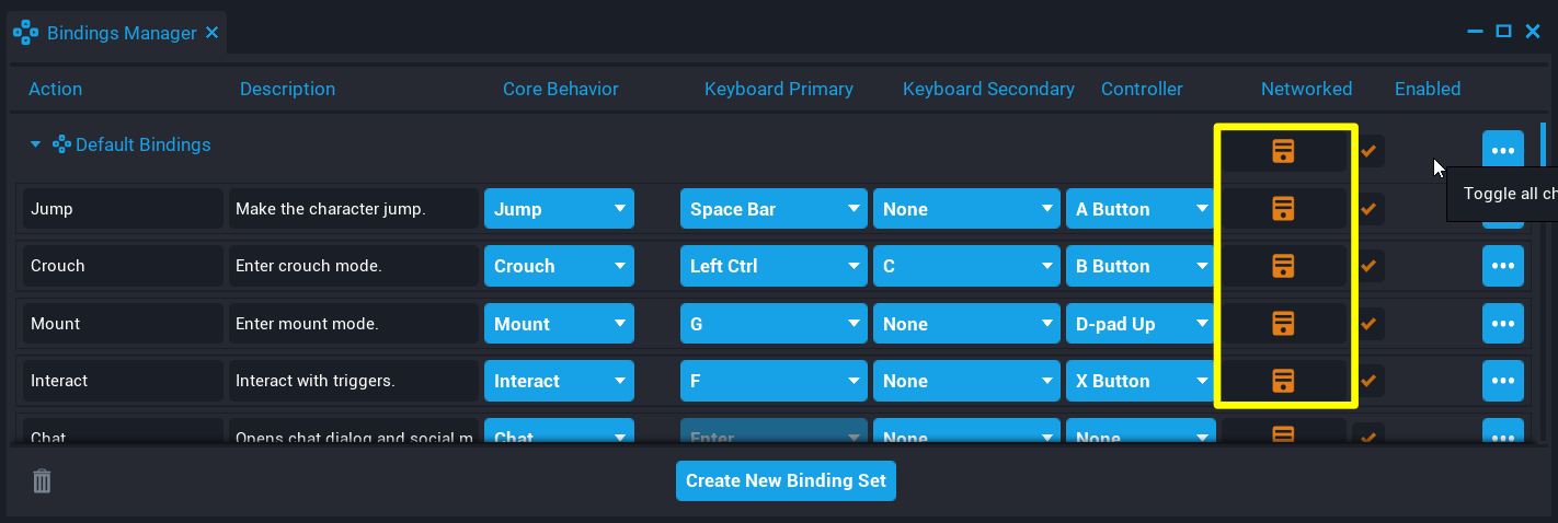 Bindings can be networked so the value and input events are replicated to the server. Replicated bindings allow creators to use specific Input functions and events in a server script using Lua. Networked bindings can be set individually or for all child bindings of a Binding Set in the Bindings Manager.