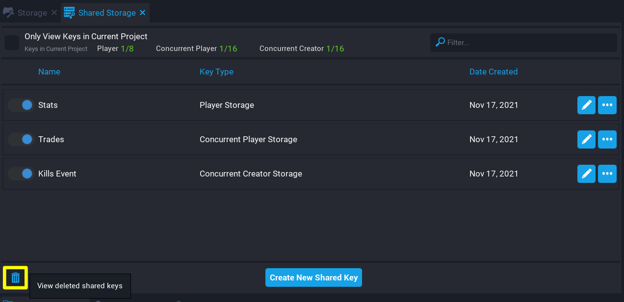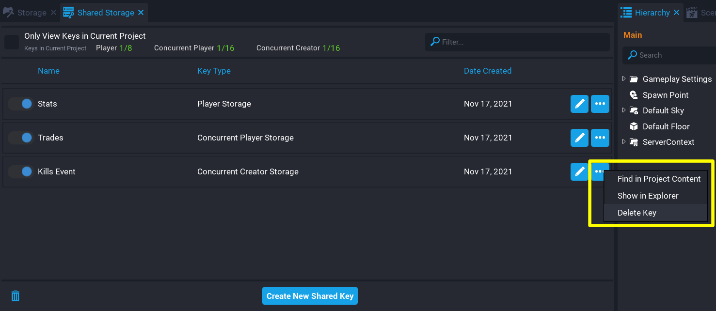 Creators can have 1 concurrent player key per game, up to 16 concurrent shared player keys, and up to 16 concurrent creator keys. In each project, creators can select which keys are active through the Shared Storage window. Active keys can be found in the Project Content window in the My Shared Keys folder, and are accessed in scripts by their Net Reference.