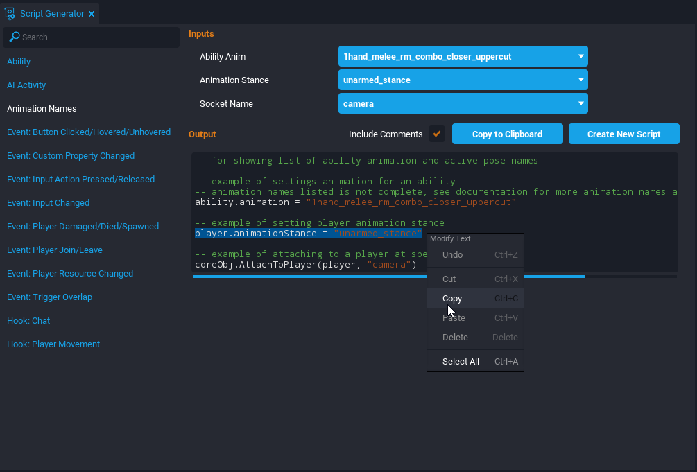 Depending on the type of script, there may be options available to change the script to a creator's preference. One example is the Ability script type has options to include or exclude functions that connect to certain ability events. Another example is the Animation Names script type has a dropdown menu to choose an animation stance for the player.