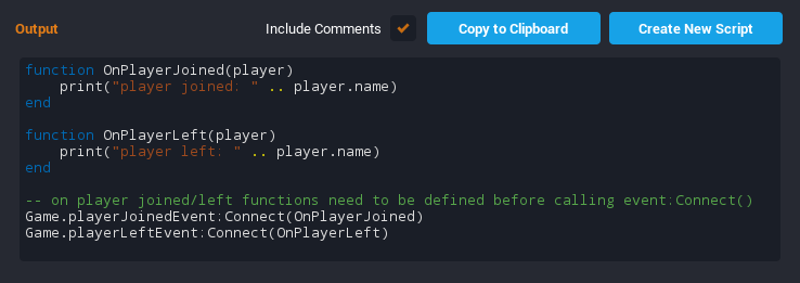 | Event: Player Join/Leave | Creates two functions that connect to the events of a Player joining and leaving the game. | Server context. |