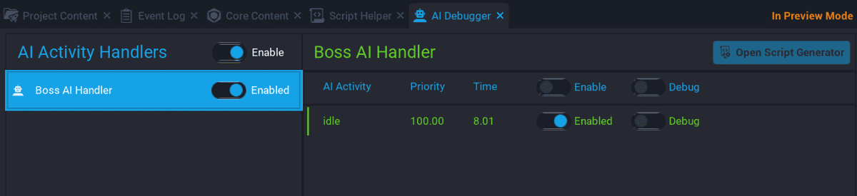 In this section you will be create the AI for the boss. The boss needs to transition between different states depending on what is happening in the game. You will use an AI Activity Handler that will have 2 activities for handling the idle and shoot states.