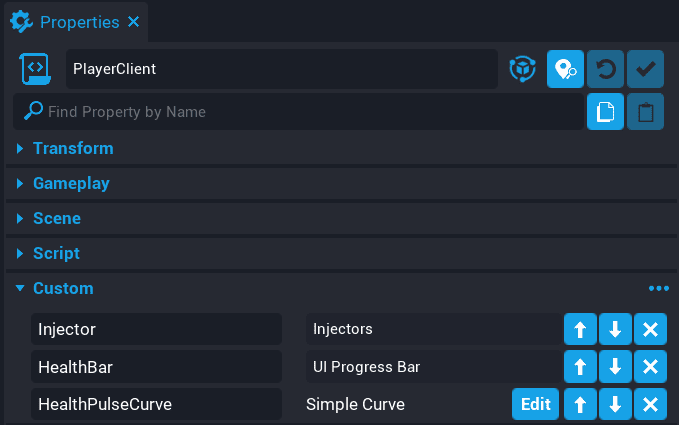 Add a SimpleCurve custom property to the PlayerClient script. Name the custom property HealthPulseCurve.
