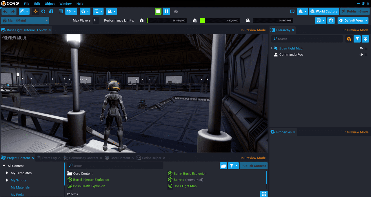 In this tutorial you are going to create a multiplayer boss fight. Players will need to disable all of the generators by inserting a pickup that can be found around the map. After all generators have been disabled, the boss will then be vulnerable to damage.