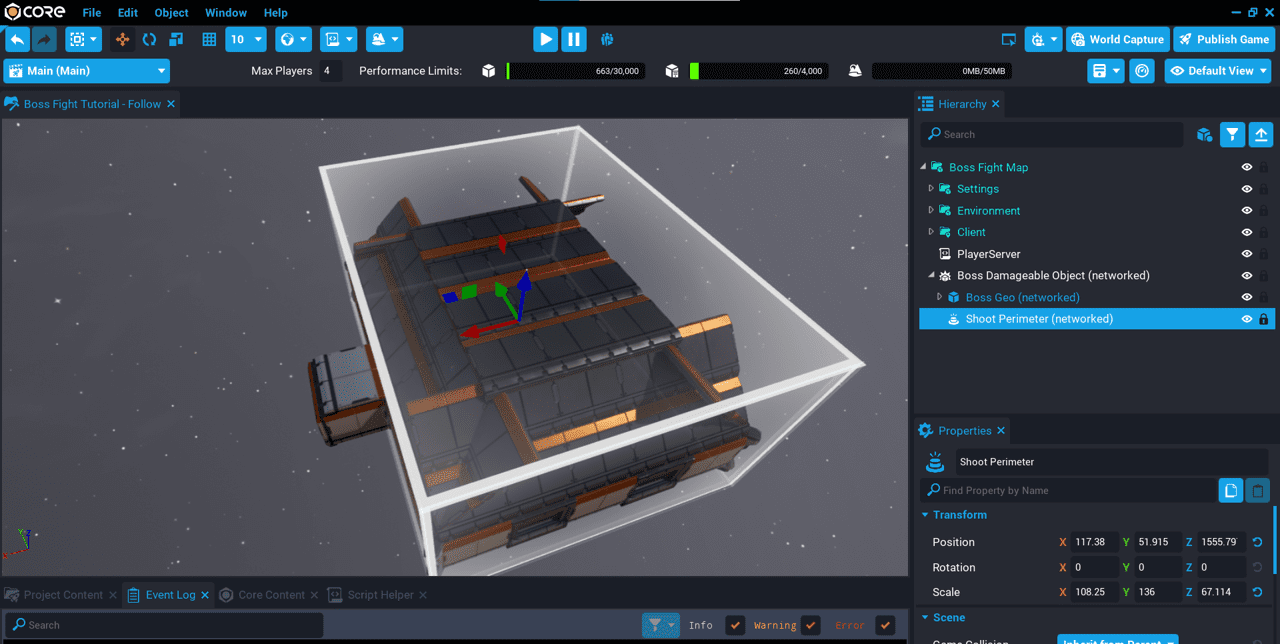 Add a Damageable Object to the Hierarchy. You can find this in Core Content under Gameplay Objects. Name the Damageable Object Boss Damageable Object.
