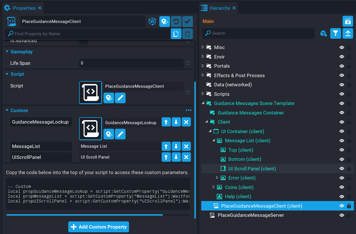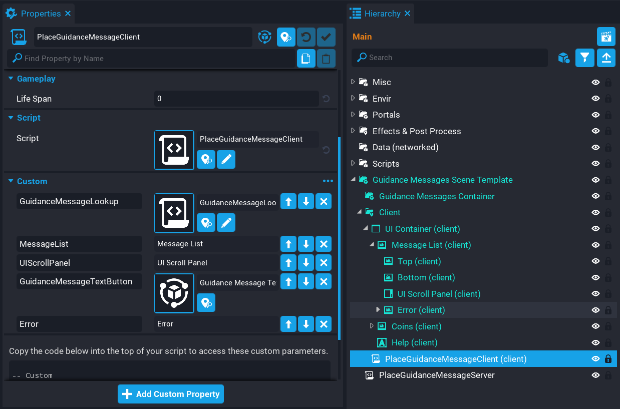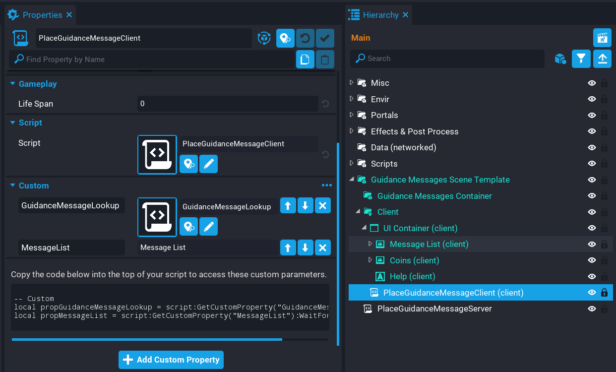 Inside the Guidance Messages Scene Template group in the Client folder, find the text object called Coins Amount and added it to the PlayerCoinsClient script as a custom property. This text object will be updated when the player's coins resource is updated.