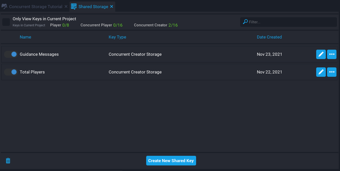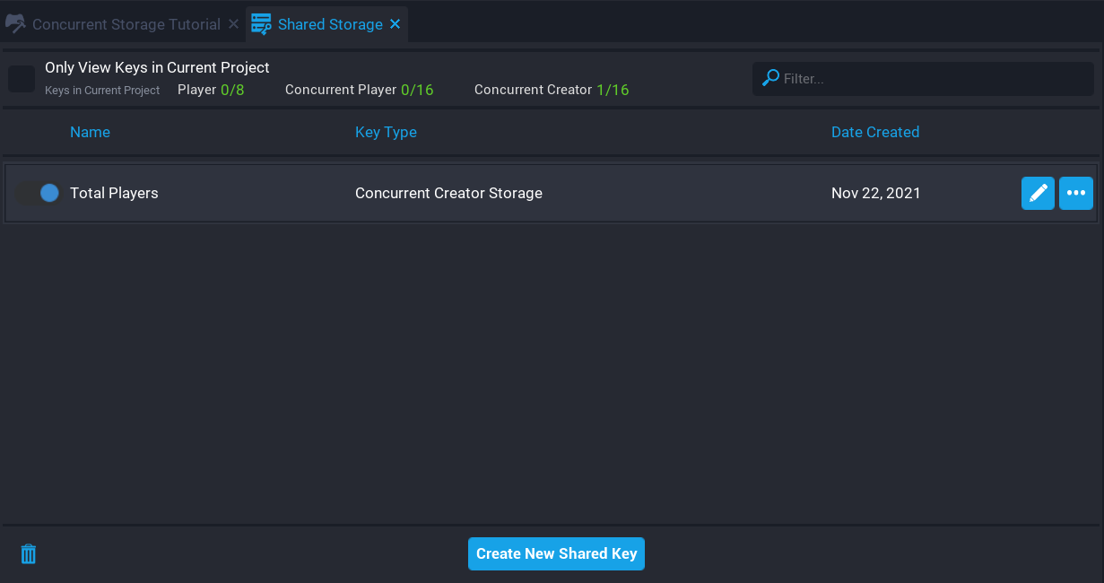 From the Window menu open up the Shared Storage window and create a Concurrent Creator Storage key called Total Players. This key will keep track of how many players are in each scene.