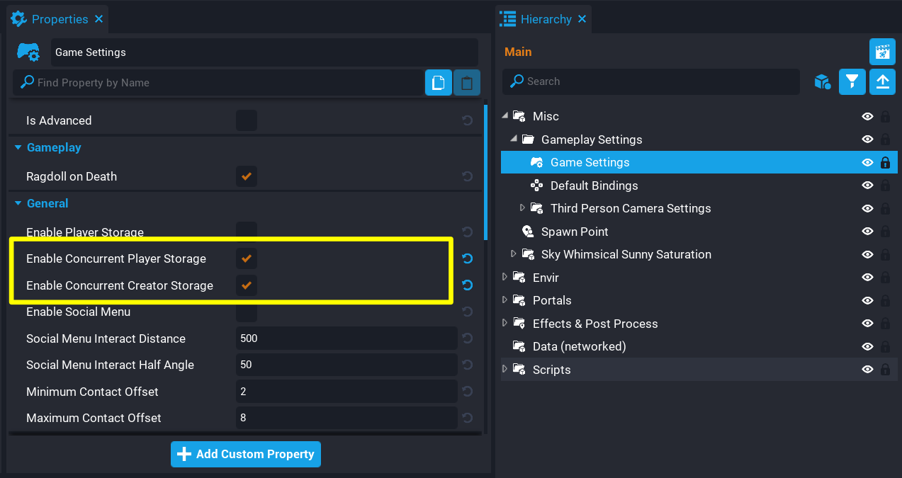2. In the Properties window enable Concurrent Player Storage and Concurrent Creator Storage.