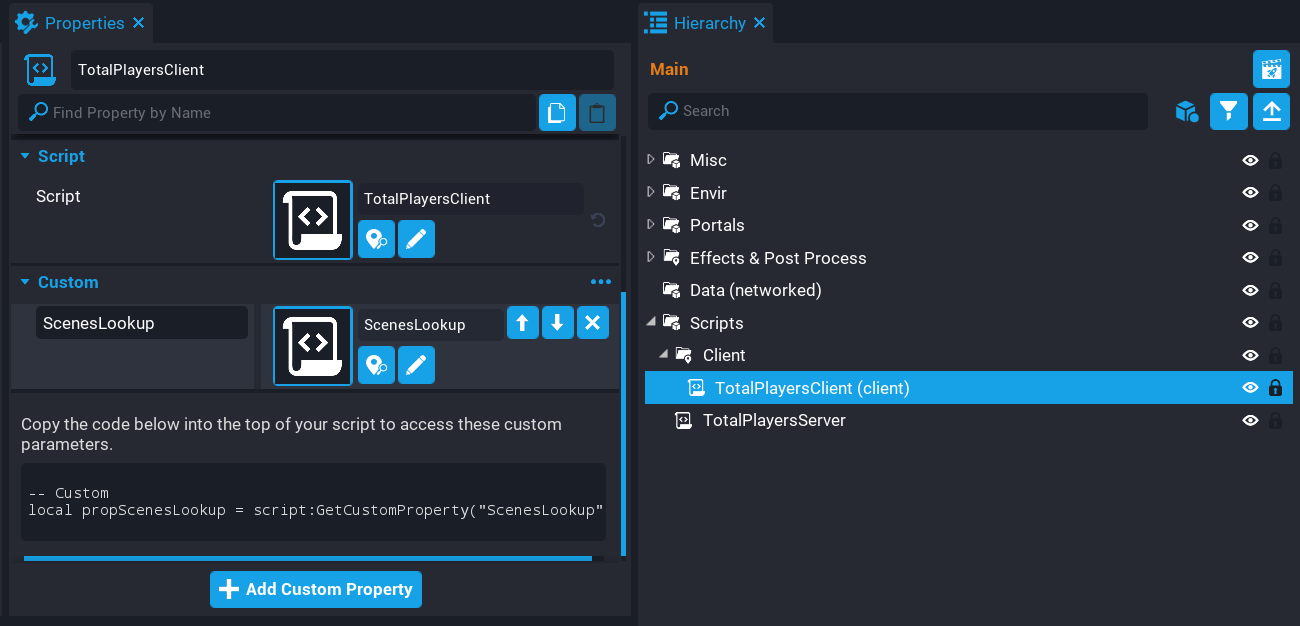 Open up the TotalPlayersServer script and add the following code so you have references to the custom properties. The SCENES_LOOKUP variable needs a reference to the table returned by the ScenesLookup script, so you will need to require the script.