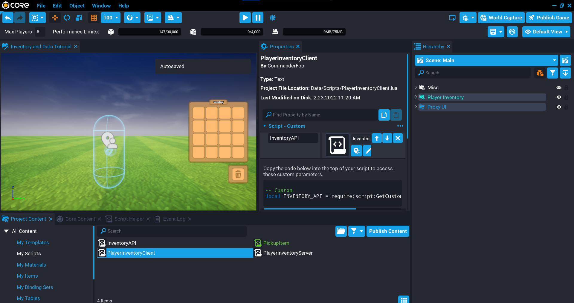 You will be importing an asset from Community Content that will contain assets to help build up the project. These assets have been designed for ease of use so you can focus on the inventory API and objects.