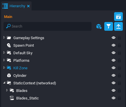 In the Hierarchy, multi-select the MovingPlatform_Server script and Moving Platform (networked) object by holding down Ctrl button while left clicking the mouse. Right click and select the New Group Containing These option. Name the group Moving Platform.