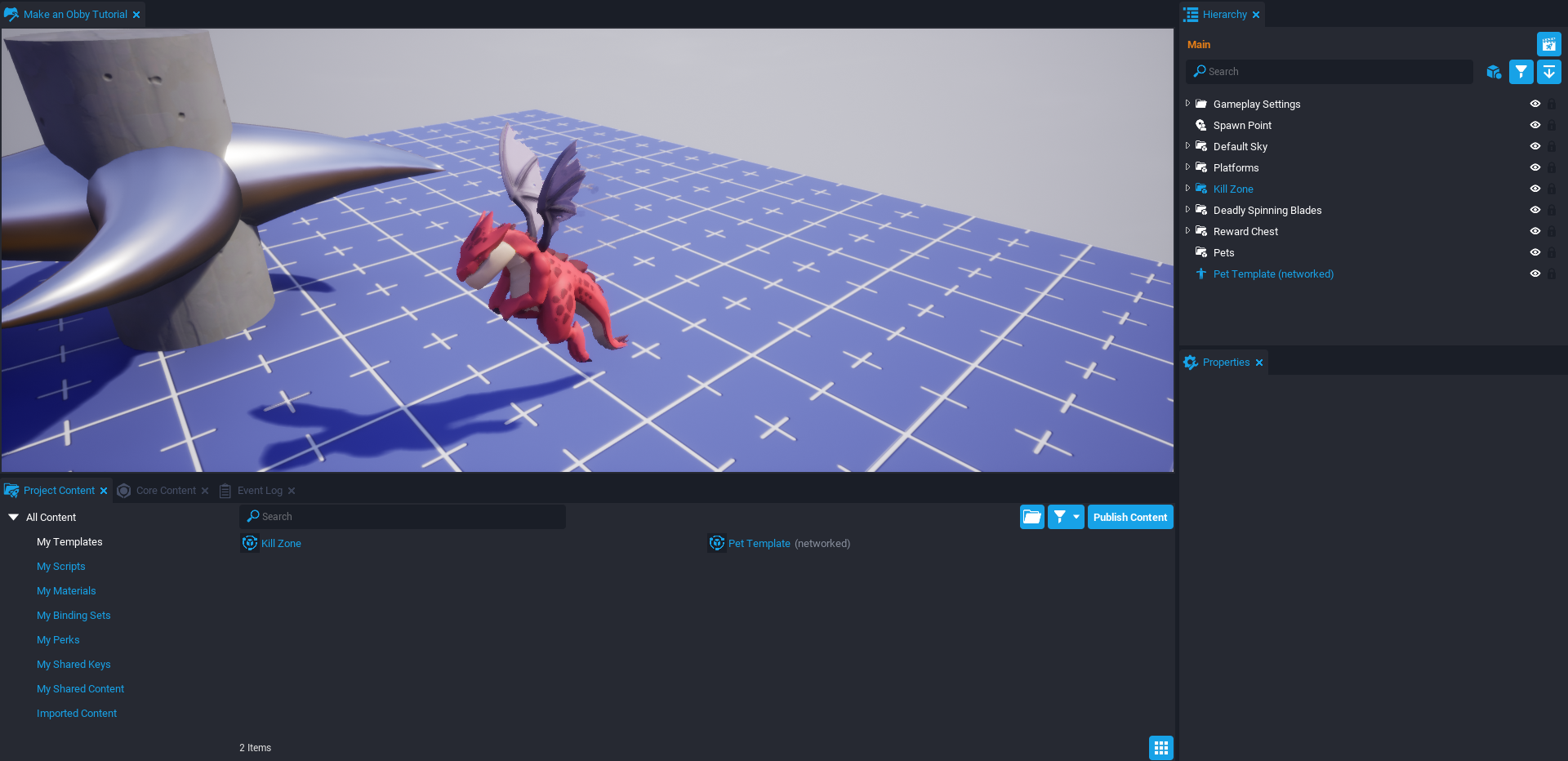 In this tutorial, you are going to make an Obby, which is a platform and obstacle game. The game will have moving, rotating, and shrinking platforms as well as deadly spinning blades. The game will also have a rewards chest that can animate open and close. The reward inside is a flying pet that follows the player.