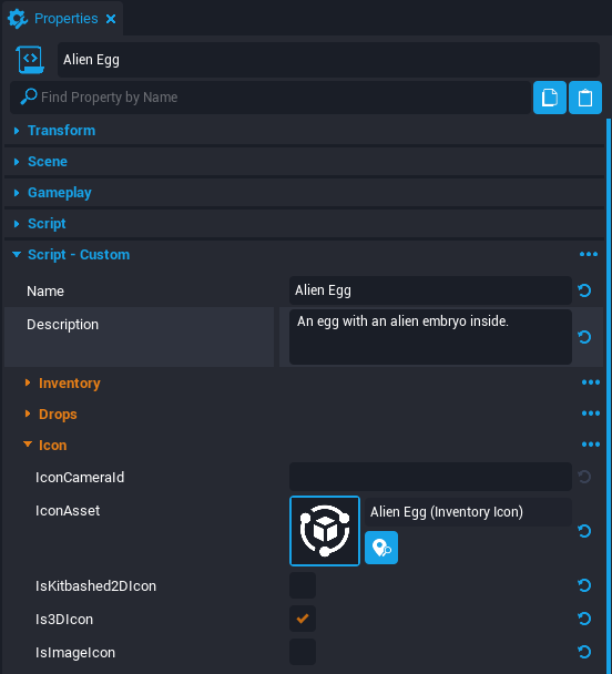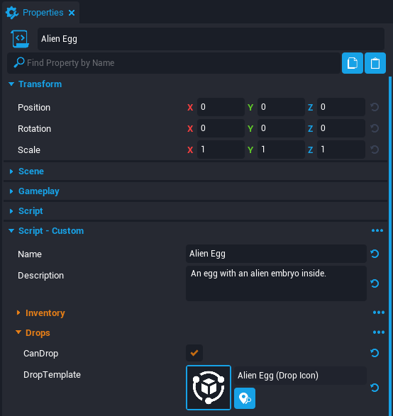 Alien Eggscript and open the Properties window. - Set the DropTemplate property to Alien Egg (Drop Icon).