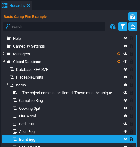 In the Hierarchy, open the Global Database folder and then expand the Items script. Any item that is placed in the inventory needs data in this group. Right click the Red Fruit script and select Duplicate. Rename the duplicated Red Fruit script to Alien Egg.