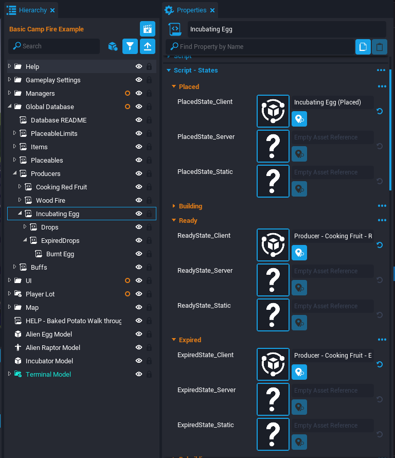 This tutorial will be breaking apart an example scene where the player can light a camp fire and cook fruit on the fire. This tutorial will make a similar Producer that can raise Alien Eggs to become Alien Raptors.