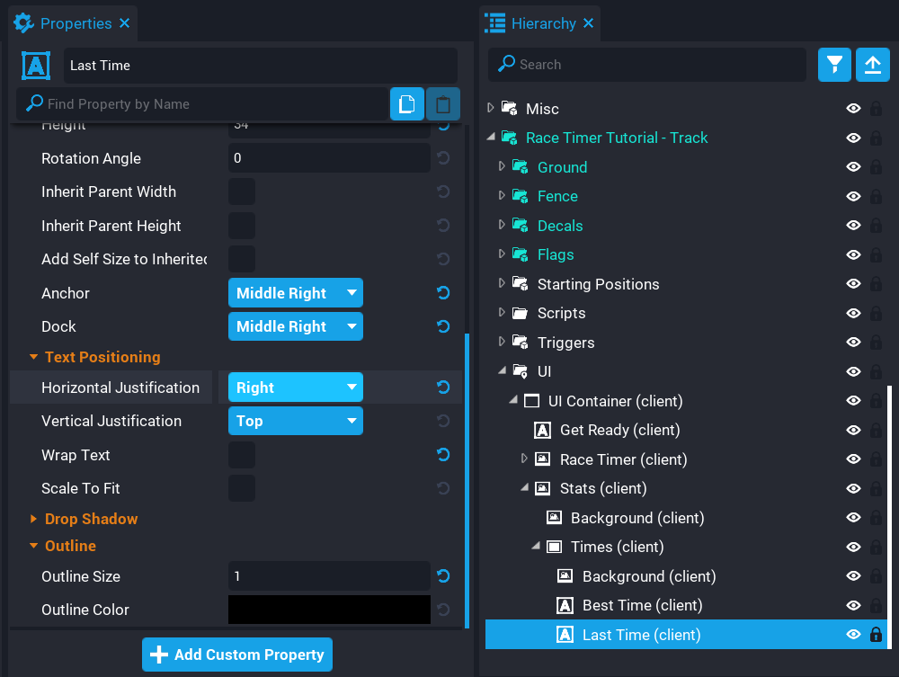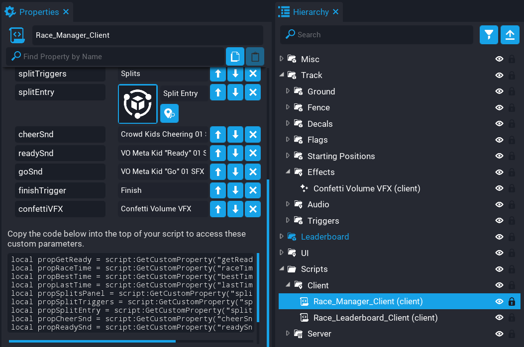 Create a new script called RaceManager_Server and place the script you created into the Server Context folder. Before opening the script, you need to set up the custom property for the positions so Lua has access to them.