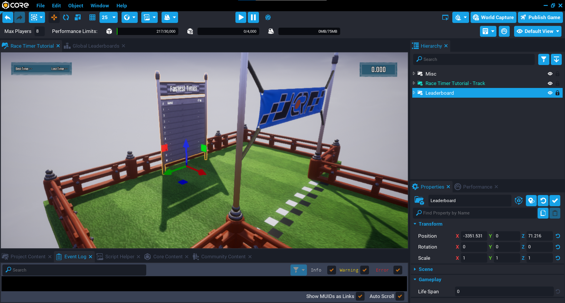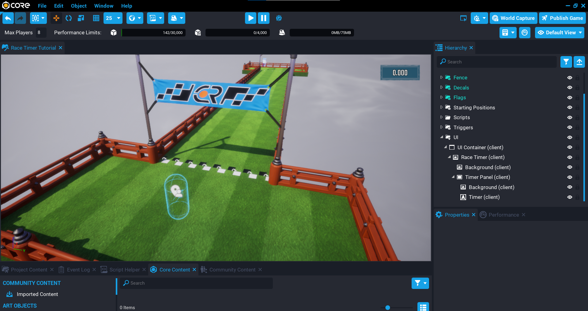 A track has been uploaded to Community Content to help you get started. This can be imported from the Community Content window by searching for Race Timer Tutorial - Track by CoreAcademy.