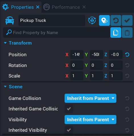 You need to scroll down in the Properties window until you a section named Vehicle. In the Vehicle section you will see two properties Max Speed and Acceleration. The Max Speed property controls the maximum speed of the Pickup Truck. The Acceleration property of the Pickup Truck controls the acceleration of the Pickup Truck.